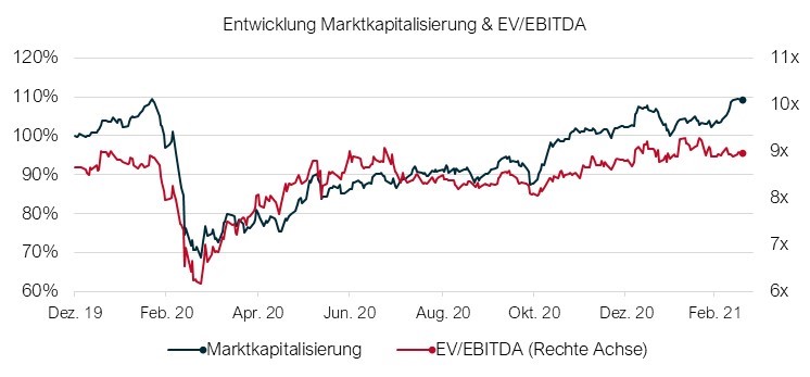 Gut ein Jahr nach dem Ausbruch der Corona-Pandemie in Deutschland erreichte die Marktkapitalisierung der Unternehmen im Business Services-Index das Vorkrisenniveau. Neben einer allgemeinen Markterholung ist ein erhöhtes Interesse von Investoren an Value-Unternehmen zu konstatieren. Der Vergleich zum DAX30, der eine noch stärkere Entwicklung aufweist, legt den Schluss nahe, dass bei der Marktkapitalisierung der Unternehmen im Business-Services-Index noch weiteres Potenzial vorhanden sein könnte.
