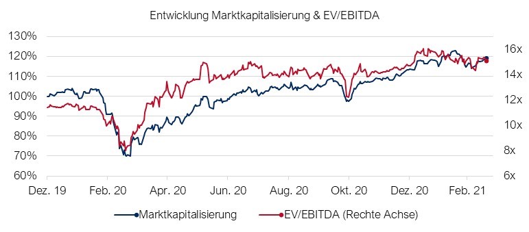 Bewertungen mit durchschnittlich 15,1x EBITDA, aktuell 32% höher als im Dezember 2019.