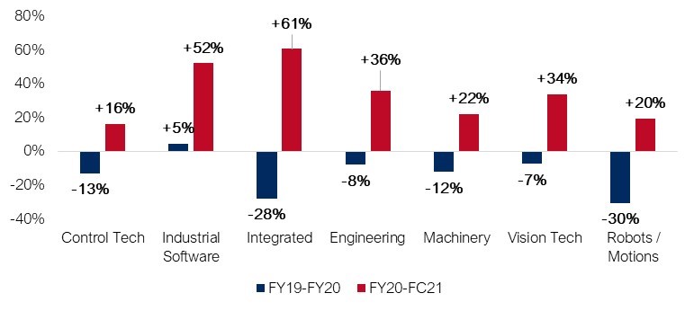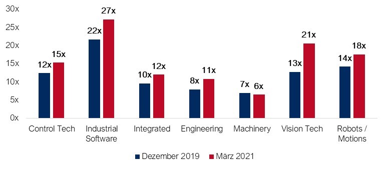 Gut ein Jahr nach dem Ausbruch der Corona-Pandemie in Deutschland erreichte die Marktkapitalisierung der Unternehmen im Industrial Technology-Index wieder das Vor-Covid Niveau. Grundlage bildete eine allgemeine Markterholung, getrieben einerseits durch ein starkes Wirtschaftswachstum in China sowie andererseits durch das weiterhin niedrige Zinsniveau und hohe Pandemie-Unterstützungsprogramme in Europa und insbesondere den USA. Während der Industrial Technology-Index bereits eine bessere Entwicklung zeigt als der DAX30, sehen wir noch deutlich weiteres Potenzial.