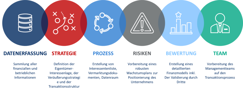 Käufer versuchen, das Überraschungsmoment für sich zu nutzen, indem sie proaktiv Angebote unterbreiten. Solche Angebote liegen oft nicht nur unter dem erzielbaren Marktpreis, sondern sie adressieren Unternehmen und Eigentümer unvorbereitet. Durch einen professionell strukturierten Veräußerungsprozess lassen sich die Erfolgswahrscheinlichkeit einer Transaktion erhöhen und die Transaktionsbedingungen, inklusive des finalen Kaufpreises, zugunsten des Verkäufers optimieren.