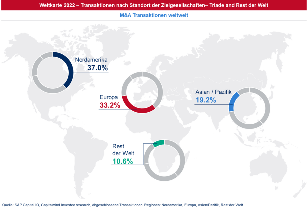 2022 wurden weltweit rund 2200 Transaktionen abgeschlossen. Das entspricht einem Rückgang von etwa 9%. Der Anteil Europas blieb stabil, Nordamerika fiel etwas zurück zugunsten vor allem der Region Asien/Pazifik.