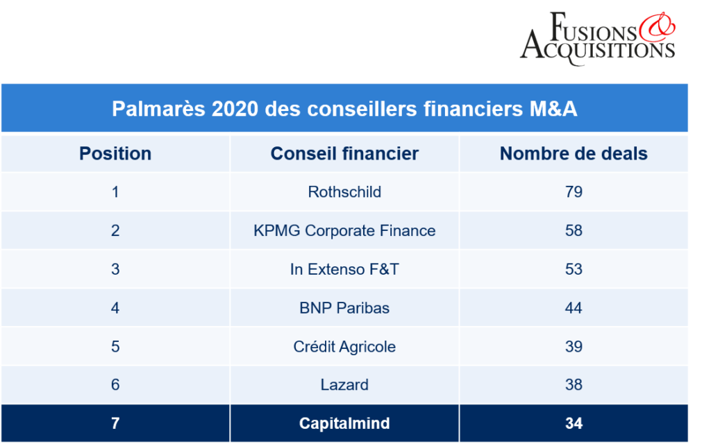 Nous tenons à remercier nos clients pour leur confiance renouvelée, et nos équipes pour leur travail et leur dévouement en cette année si particulière. Une 7ème place au Palmarès du magazine Fusions & Acquisitions bien méritée, bravo à tous !