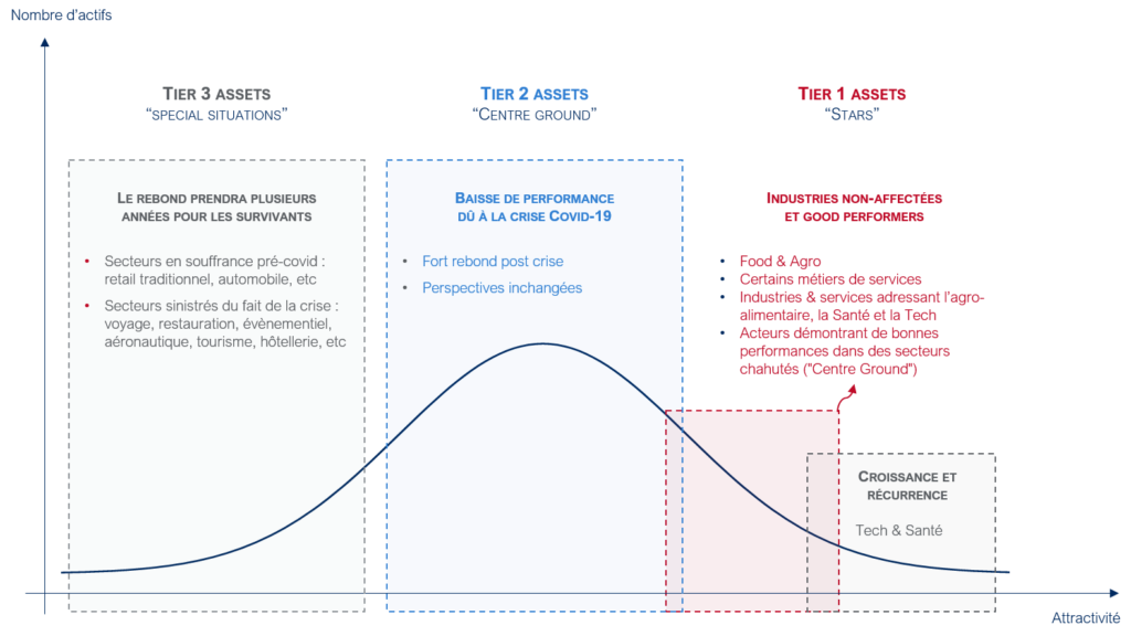 - Le « Centre Ground » est composé de l’essentiel des sociétés de services et d’industrie. Ces sociétés ont été affectées par la crise sanitaire, vont connaître une baisse de performance sur l’exercice en cours, mais n’encourent pas de problème de survie. Le soutien massif de l’état au travers des mécanismes de chômage partiel et l’injection de liquidités au travers des PGE permet à ces sociétés de surmonter la crise, et nombre d’entre elles mettent cette période à profit pour améliorer leur efficacité opérationnelle, accélérer leur digitalisation et ajuster leur organisation pour relancer la mécanique. Le marché du M&A pour ces acteurs est à l’arrêt pour trois raisons : tout d’abord car les marges de manoeuvres des acquéreurs industriels sont limitées, notamment du fait de bris de covenants bancaires ou parce qu’ils n’ont pas distribué de dividendes – il est donc plus difficile d’expliquer aux actionnaires qu’il faut dépenser de l’argent pour des acquisitions ; deuxièmement car les investisseurs financiers attendent le rebond et la confirmation de la reprise ; enfin, parce que les vendeurs se donnent du temps pour privilégier une meilleure valorisation dans 12 à 18 mois.