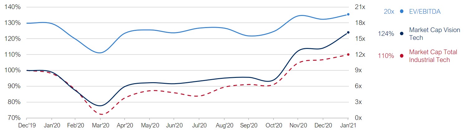 Interesting to observe that market capitalization of Vision Technology companies did not suffer as much as the overall Industrial Tech sector index. Although the entire Industrial Tech sector recovered throughout 2020, the Vision Tech sector kept its strength and even outperformed the overall index in the last couple of weeks.