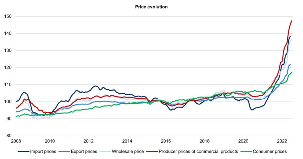 - The end of the line has probably not yet been reached: Inflation of producer prices, wholesale prices and import prices reached new highs in May 2022. For example, producer prices rose by +33.6% year-on-year. Producer prices are considered a major indicator of consumer inflation.