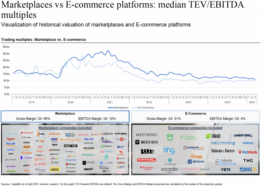 As can be seen on the chart below, Marketplaces consistently trade at higher EBITDA multiples than traditional E-commerce players, with a peak in early 2021 driven primarily by the COVID-19 pandemic. However, since mid-2021, as economies reopened and consumer behavior normalized, both sectors have seen more stable multiples, with marketplaces typically maintaining a premium over traditional E-commerce due to scalability and an asset-light model.