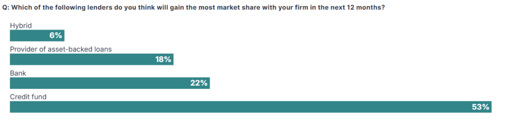Around half of the respondents expect credit funds to do more business with their firm during the year, but banks remain highly competitive; almost a quarter (22%) say they expect to place more lending with banks in the next 12 months. Hybrid capital is gaining particular traction for smaller managers with assets of $250m or less, with a quarter of these saying this type of lender will gain the most market share at their firm in the next year.