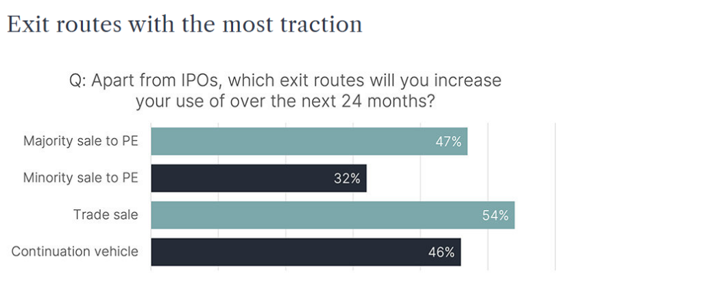 The squeeze on other exit routes meant there has been greater use of continuation vehicles which are here to stay as a mainstream exit path: more than 40% of GPs say a continuation fund will be an exit option they are more likely to use in the next 12 months.