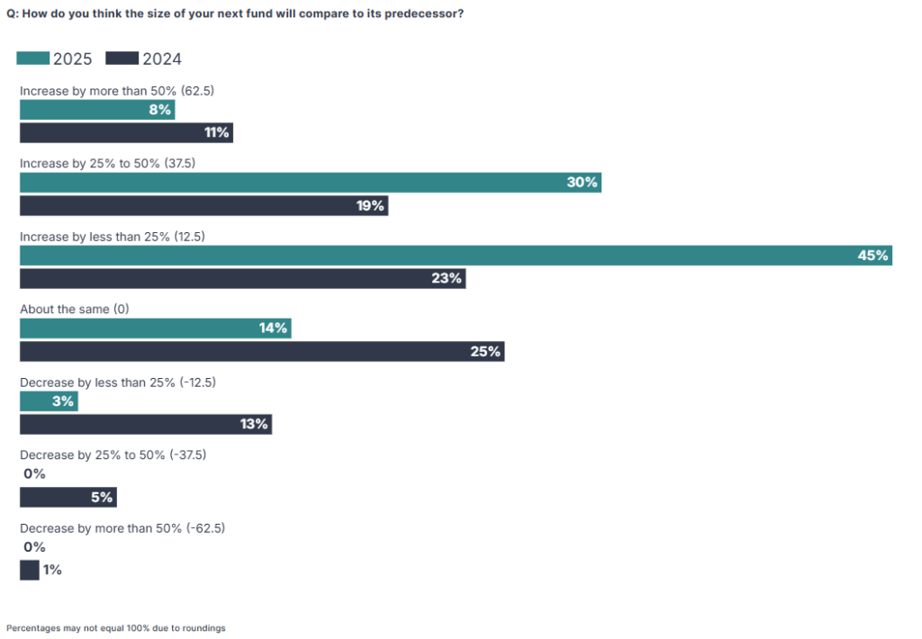 In 2024, 21% of respondents expected a down raise for their next fund: the 2025 research shows only 3% anticipating the same scenario.