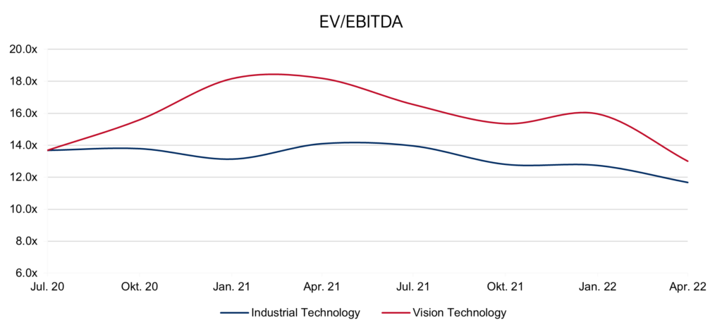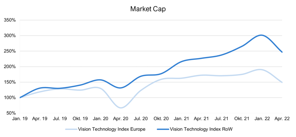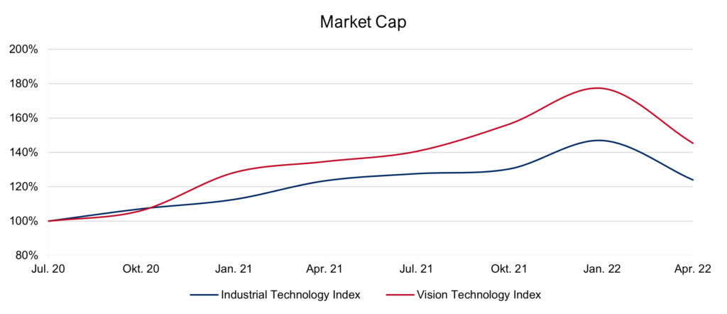 The valuations of the listed companies in our IndustrialTech and VisionTech Index have also reacted significantly to the outbreak of the armed conflict (see below). In addition, we expect effects on the earnings side of the companies resulting from indirectly effective factors such as the ongoing levels of Corona infections as well as interest rates and inflation, which may have an impact in the medium term. Notwithstanding, based on discussions with business leaders, owners, and financial investors we expect the automation sector, including machine vision, to remain highly attractive, supported by the increasing degree of digitalization and integration, developments in deep learning/AI and the further broadening of applications in the non-industrial sector.
