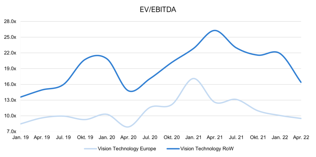 On EV/EBITDA multiple level the VisionTech companies show a comparable development, however Q1/22 reports and updated consensus estimates are not yet factored in, we will show an updated picture in the next Insight as per end of June.
